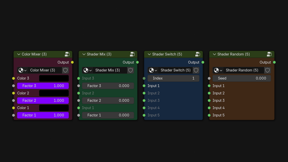 Still includes all v3.0 upgrades: Random Switcher Mode, enhanced Color Mixer blend-modes, dynamic Add/Remove Inputs, cleaner UI panel & instant node rebuilding. Blender 4.2+ compatible.